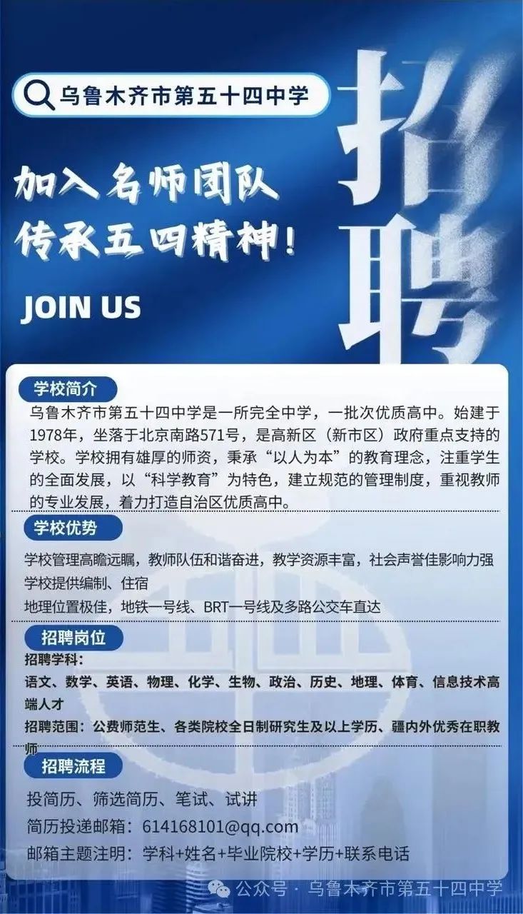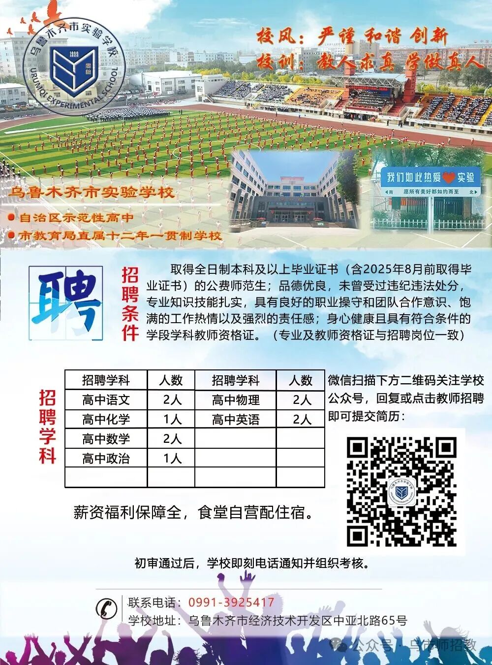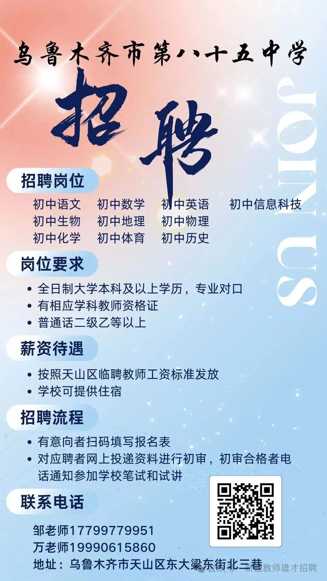 招聘岗位:初中语文;初中信息科技;初中数学;初中地理;初中物理;初中生物;初中化学;初中体育;初中历史;初中英语岗位要求:全日制大学本科及以上学历,专业对口;有相应学科教师资格证;普通话二级乙等以上。薪资待遇:按照天山区临聘教师工资标准发放;学校可提供住宿。