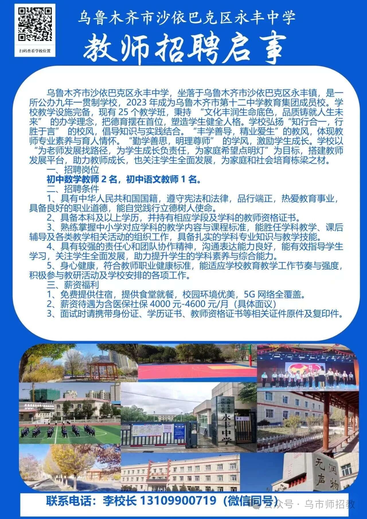 乌鲁木齐市沙依巴克区永丰中学,坐落于乌鲁木齐市沙依巴克区永丰镇,是一所公办九年一贯制学校,2023年成为乌鲁木齐市第十二中学教育集团成员校。招聘岗位:初中数学教师 2 名,初中语文教师1名。招聘条件:1.具有中华人民共和国国籍,遵守宪法和法律,品行端正,热爱教育事业具备良好的职业道德,能自觉践行立德树人使命。2、具备本科及以上学历,并持有相应学段及学科的教师资格证书。3、熟练掌握中小学对应学科的教学...