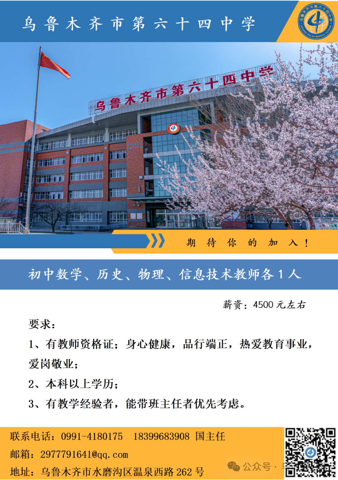 招聘岗位:初中数学、历史、物理、信息技术教师各1人薪资待遇:4500 元左右招聘要求:1、有教师资格证;身心健康,品行端正,热爱教育事业,爱岗敬业;2、本科以上学历;3、有教学经验者,能带班主任者优先考虑。