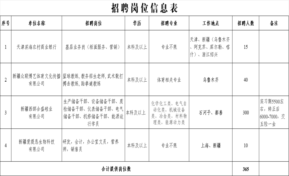 为全力推进2026届毕业生高质量就业,学校邀请天津滨海农村商业银行、新疆众联博艺体育文化传播有限公司、新疆西部合盛硅业有限公司、新疆爱缇恳生物科技有限公司等4家用人单位进校举办招聘宣讲会,提供就业岗位365个。现就有关事项通知如下: