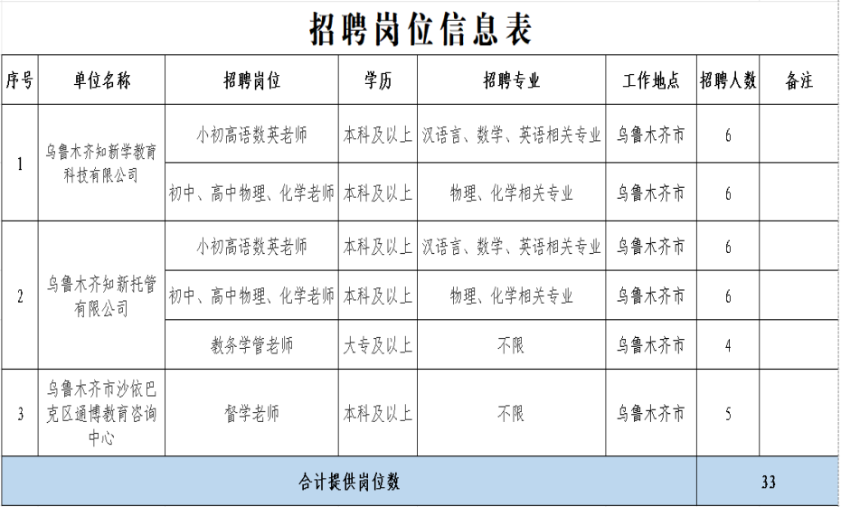 为全力推进2026届毕业生高质量就业,学校邀请乌鲁木齐知新学教育科技有限公司、乌鲁木齐知新托管有限公司、乌鲁木齐市沙依巴克区通博教育咨询中心3家教育机构进校举办招聘宣讲会,提供就业岗位33个。现就有关事项通知如下: