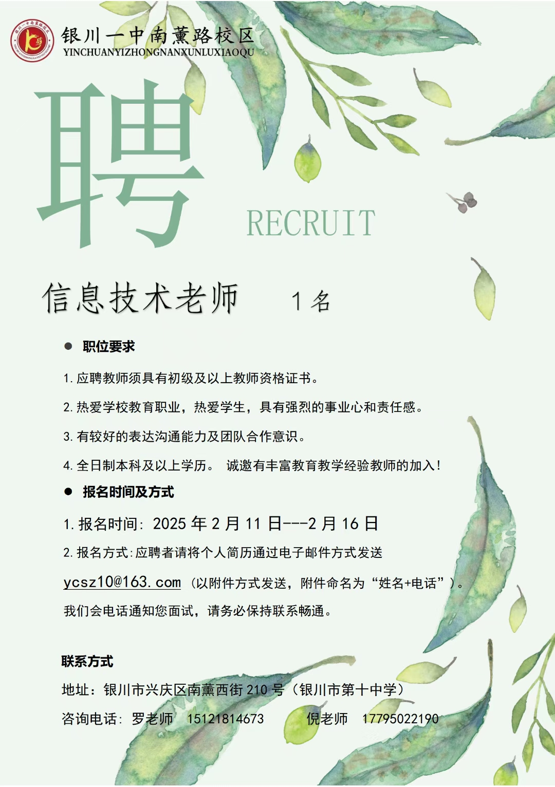 银川一中招聘信息来啦